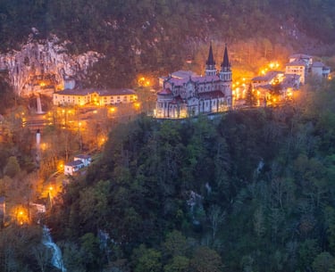 Un lieu emblématique des Asturies : un sanctuaire accroché à la montagne et, un peu plus haut, les célèbres lacs de Covadonga.